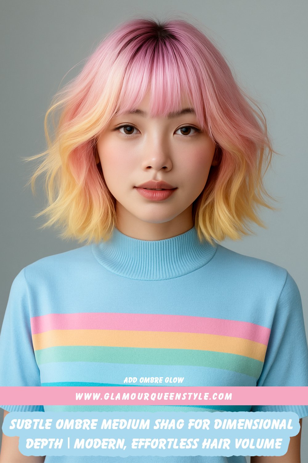 A woman wears a feathered medium shag haircut featuring wispy layers framing her face; she has glowing natural makeup and coordinates her outfit with a pastel-toned top.