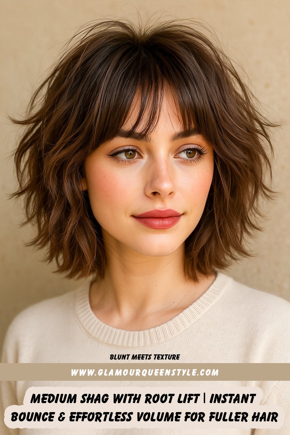 A woman displays an effortless layered medium shag haircut featuring tousled layers framing her cheekbones; she wears natural glowing makeup and coordinates her outfit with an elegant neutral-toned top.