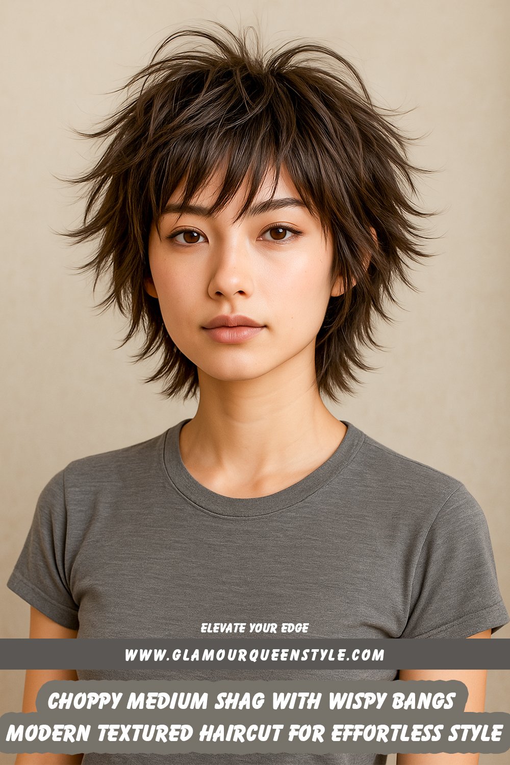 A woman showcases a textured medium shag haircut with subtle face-framing layers that gently accentuate her cheekbones; she wears luminous makeup paired with a refined neutral-toned ensemble.