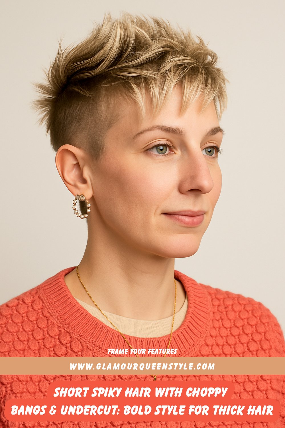 Show off your bold personality with a short, spiky haircut paired with choppy bangs and an undercut—this style is perfect if you want to turn heads. The textured spikes add movement and dimension, while the undercut keeps thick hair manageable without sacrificing edge. Choppy bangs frame your facial features beautifully, softening the look yet keeping it strikingly modern. Finish this statement hairstyle by pairing it with vibrant fashion choices—like a colorful tie-dye top—and accentuate the look further using unique gold jewelry for coordinated flair that elevates both confidence and individuality.