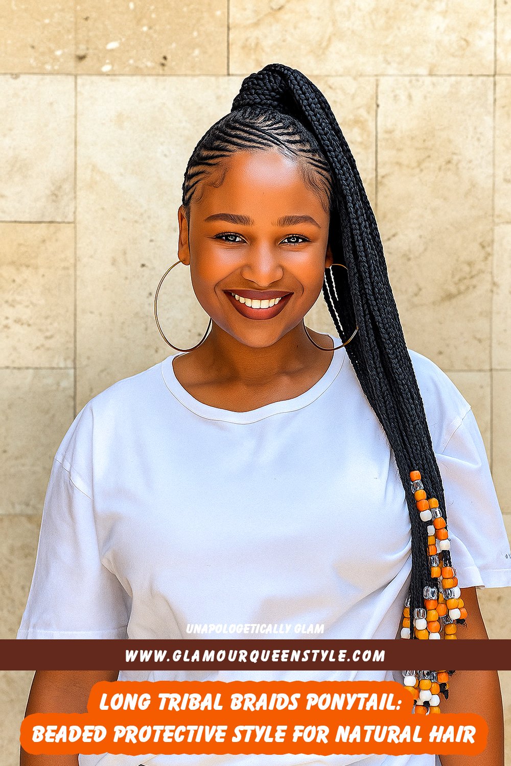 20. Long Tribal Braids Ponytail: Beaded Protective Style for Natural Hair