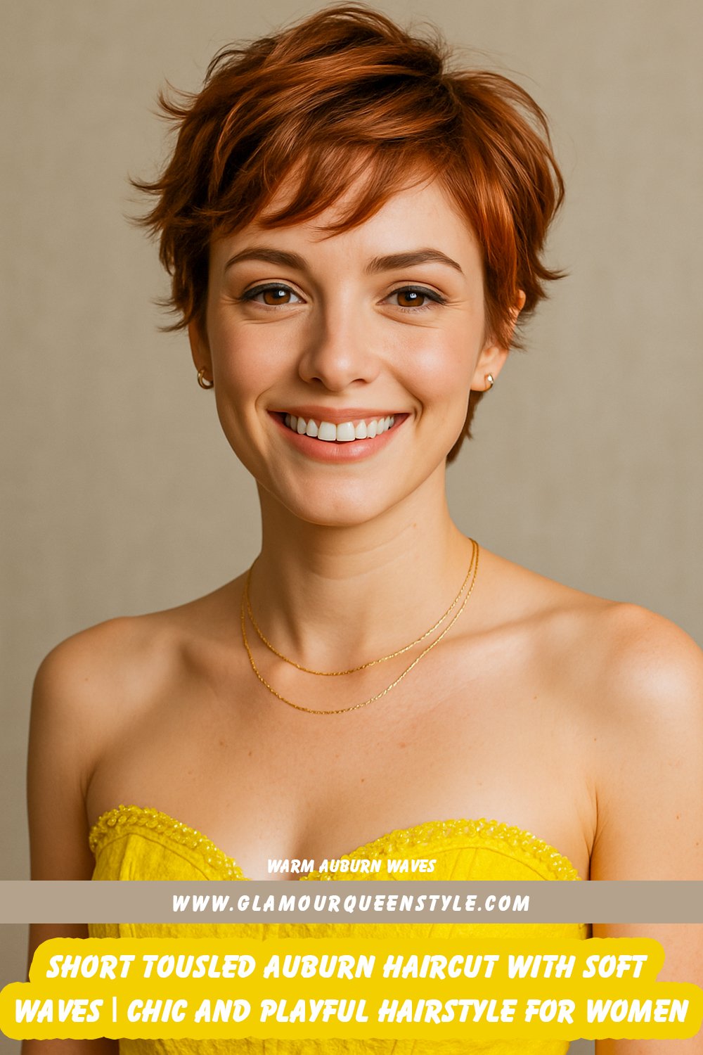 27. Short Tousled Auburn Haircut with Soft Waves | Chic and Playful Hairstyle for Women