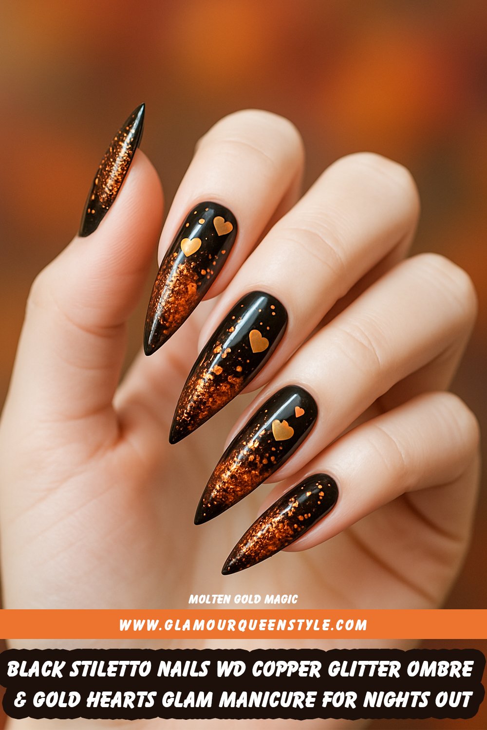14. Black Stiletto Nails with Copper Glitter Ombre & Gold Hearts – Bold Glam Manicure for Nights Out