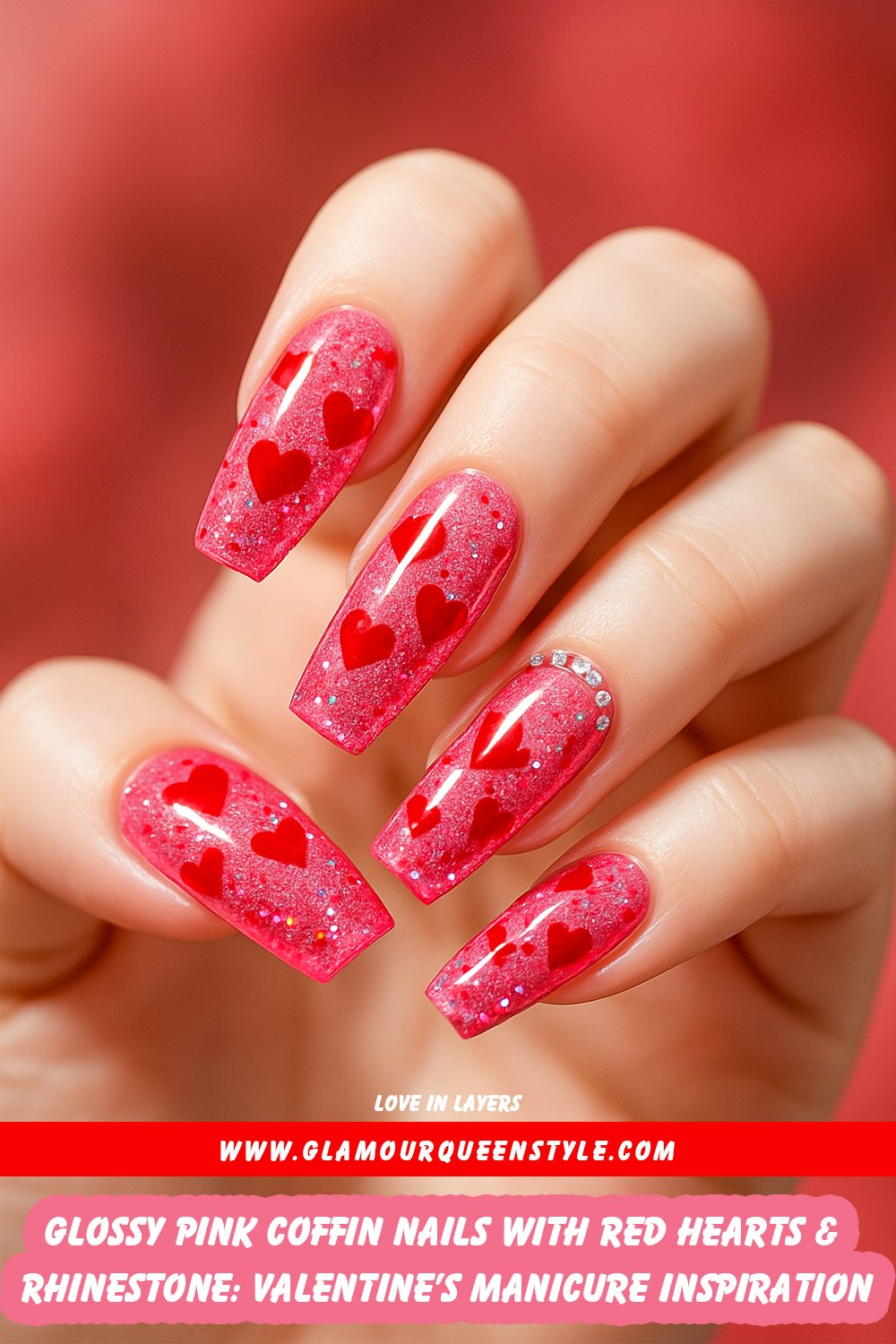02. Glossy Pink Coffin Nails with Red Hearts & Rhinestone: Valentine’s Manicure Inspiration
