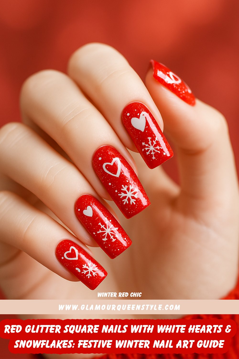 03. Red Glitter Square Nails with White Hearts & Snowflakes: Festive Winter Nail Art Guide