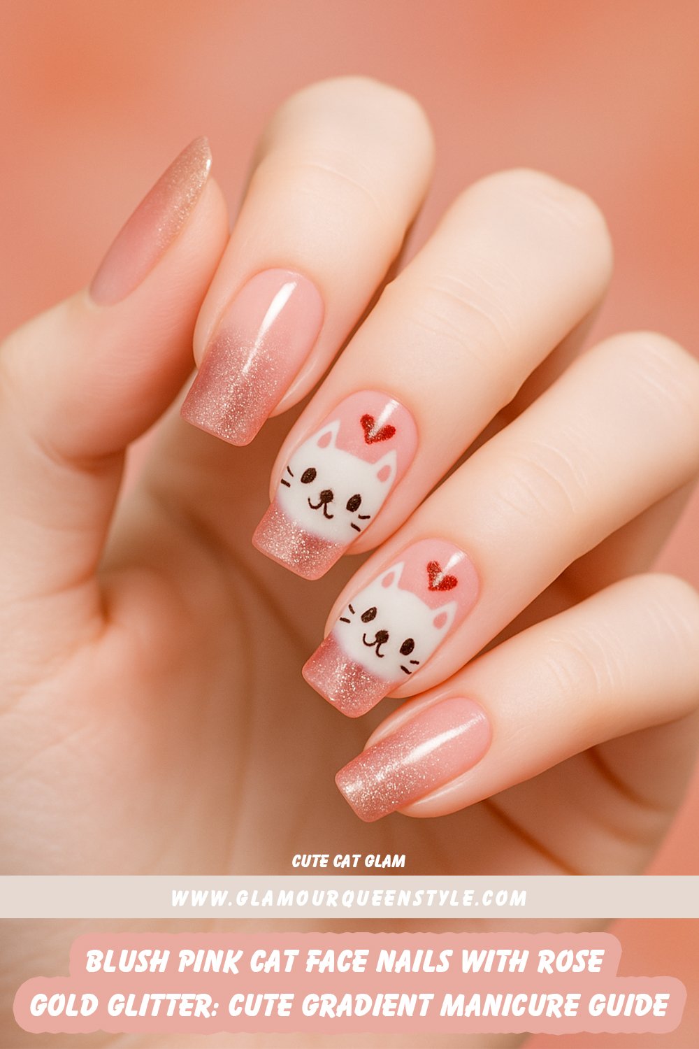 04. Blush Pink Cat Face Nails with Rose Gold Glitter: Cute Gradient Manicure Guide