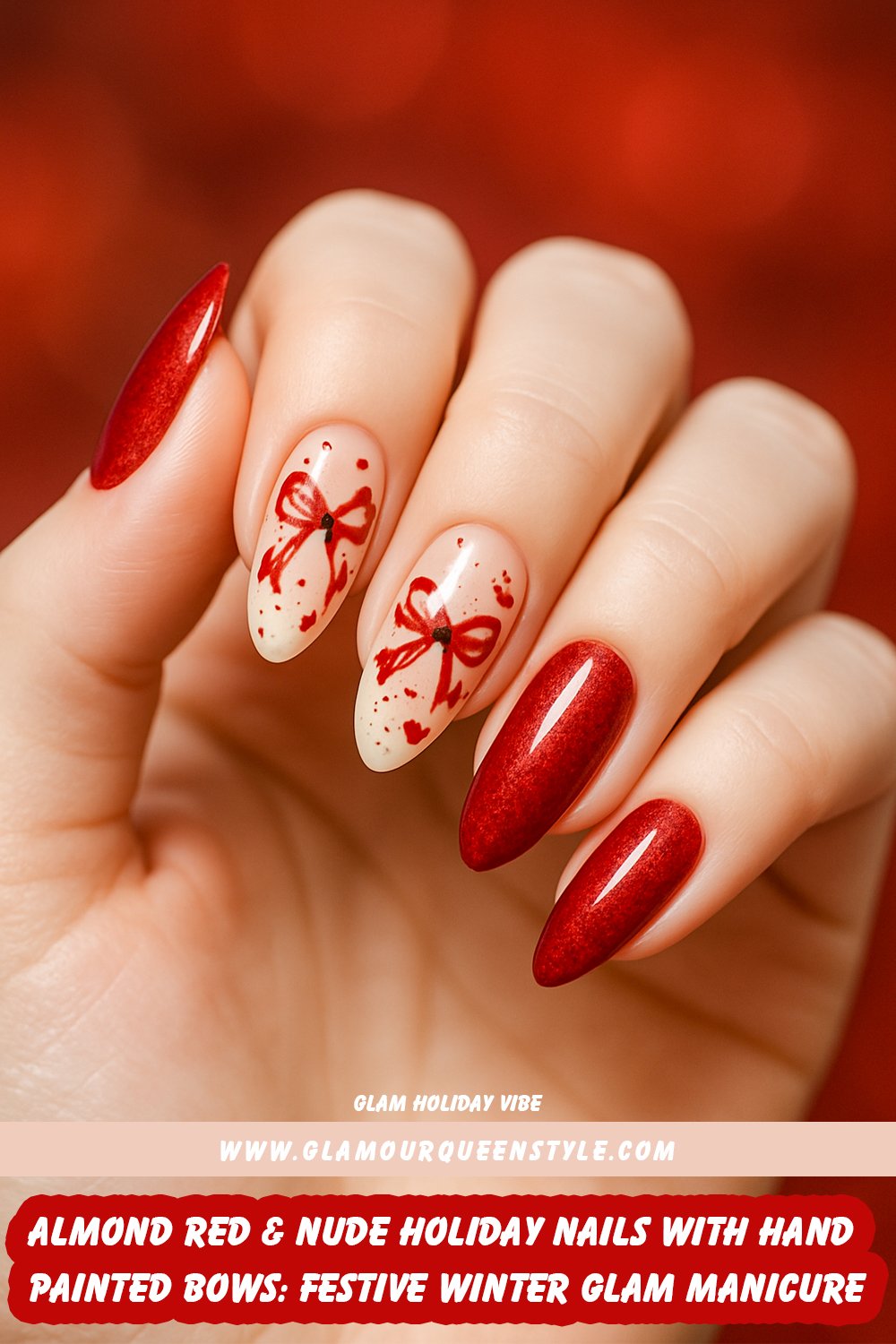 05. Almond Red & Nude Holiday Nails with Hand-Painted Bows: Festive Winter Glam Manicure