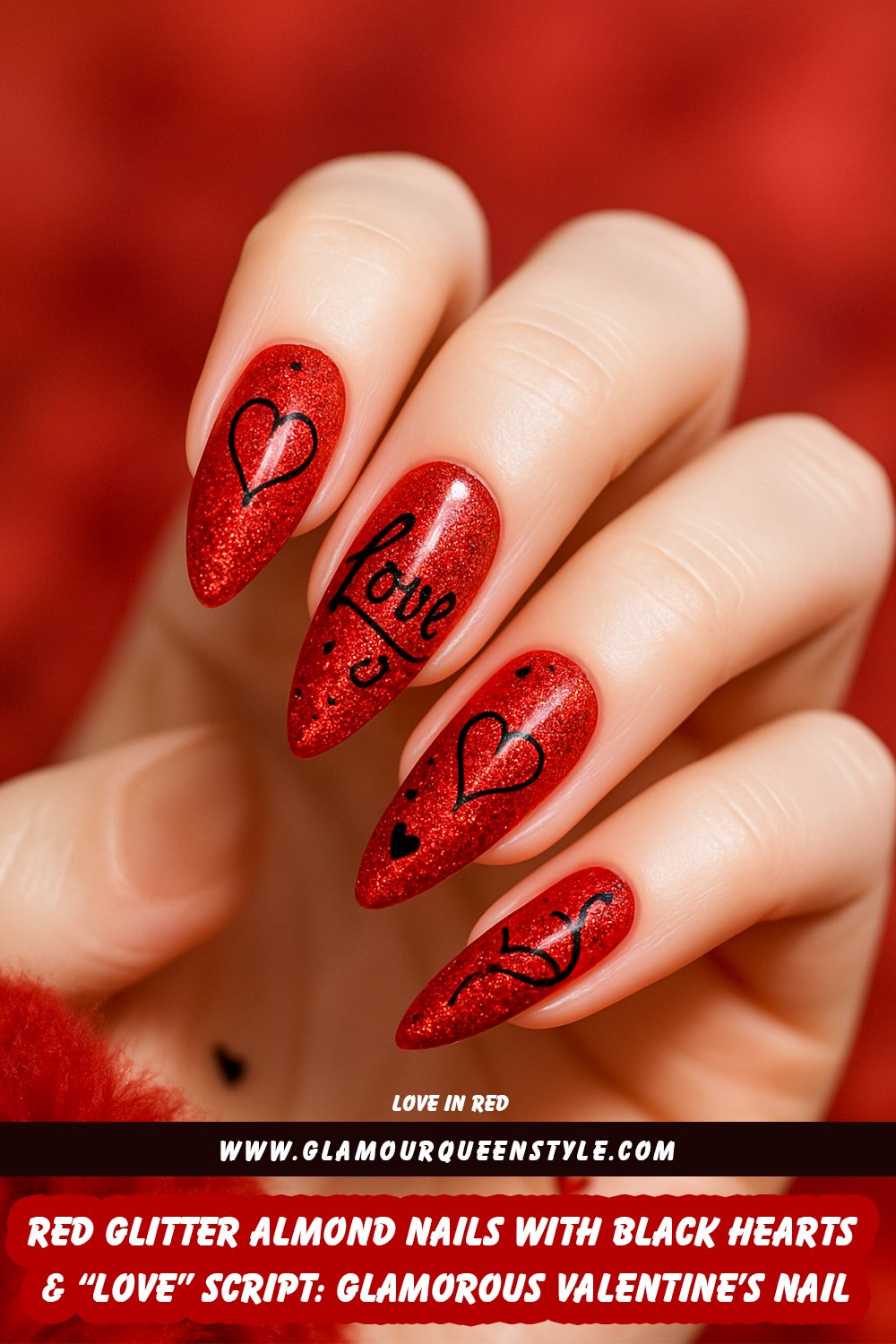 07. Red Glitter Almond Nails with Black Hearts & “Love” Script: Glamorous Valentine’s Nail Art Guide