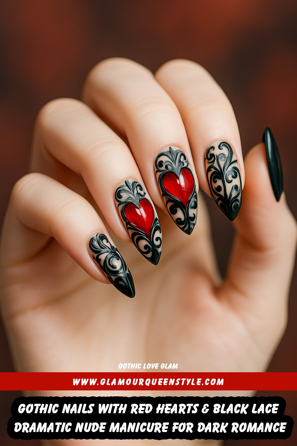 09. Gothic Almond Nails with Red Hearts & Black Lace – Dramatic Nude Manicure for Dark Romance